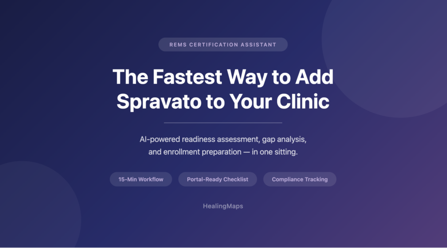HealingMaps built this tool to solve a specific problem. Clinic owners told us the same story again and again. They wanted to offer Spravato but could not justify the administrative burden of figuring out REMS on their own.